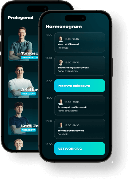 Z naszą aplikacją, Twoi goście mają dostęp do zawsze aktualnej agendy wydarzenia, informacji o prelegentach, planów miejsc i innych ważnych szczegółów. Wszystko to w zasięgu jednego kliknięcia.